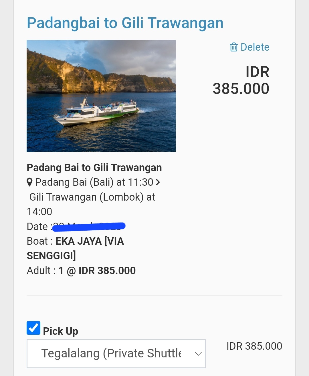 저는 이렇게 할인받은 2인 배 왕복 1232000 IDR과 프라이빗카 픽업/드롭 770000 IDR까지해서 총 2002000 IDR (한화 약 17만 1000원)에 예약을 마쳤답니다