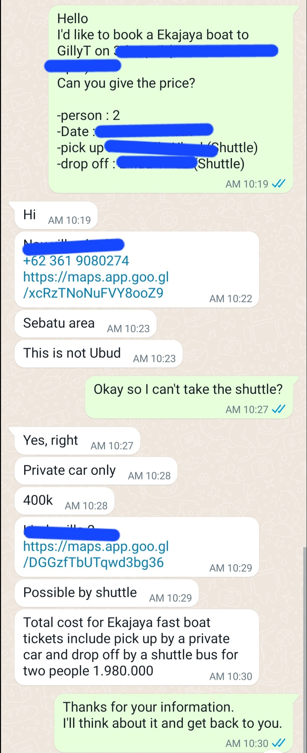 이지길리 왓츠앱으로 인원수, 날짜, 픽업드롭 등에 따른 가격을 문의하면 예약을 대행해준답니다