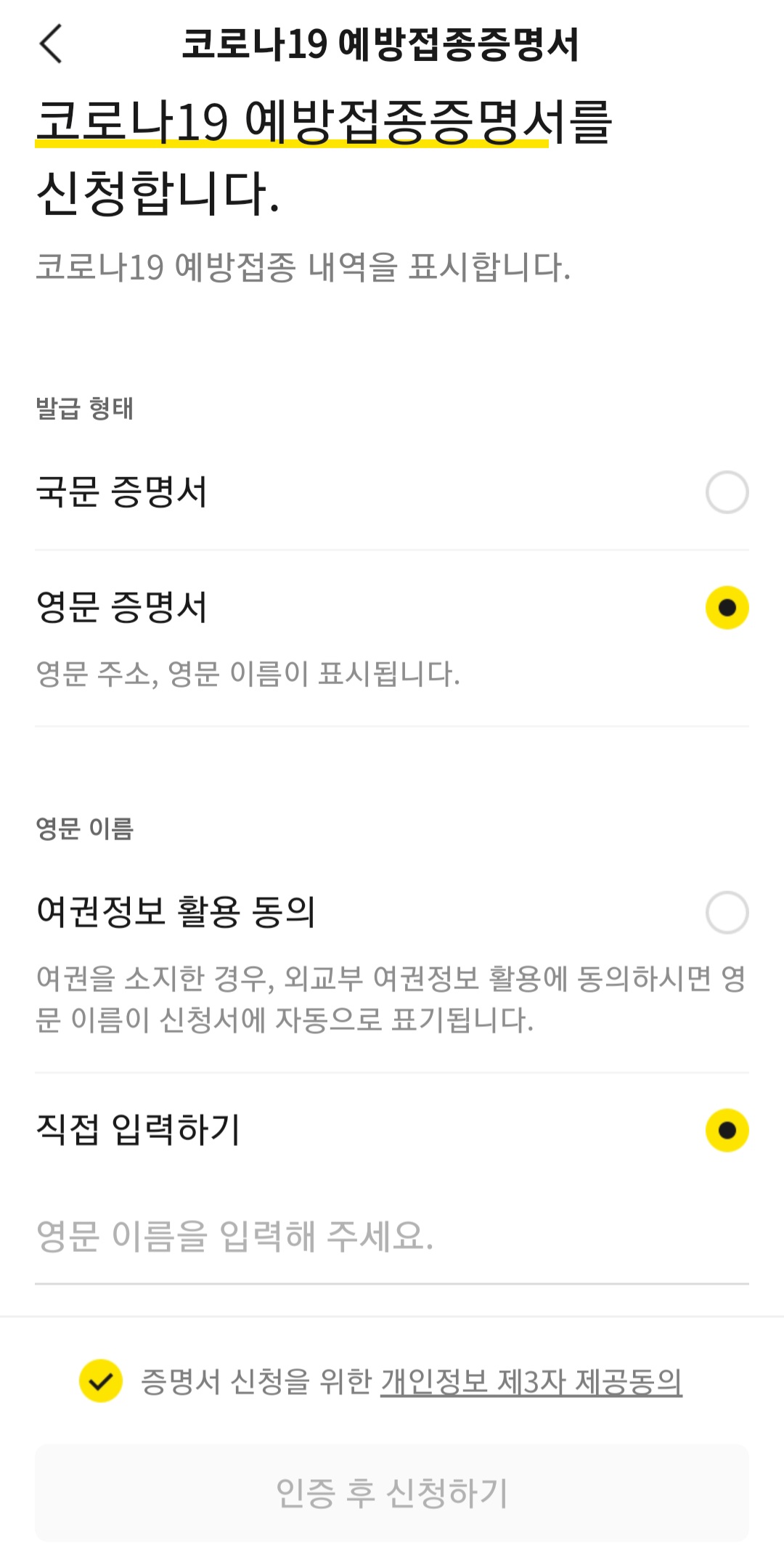 (5) 예방접종증명서 국문/영문 필요한걸 선택하고 이름과 주소 등을 입력해줍니다. 그리고 신청 클릭!