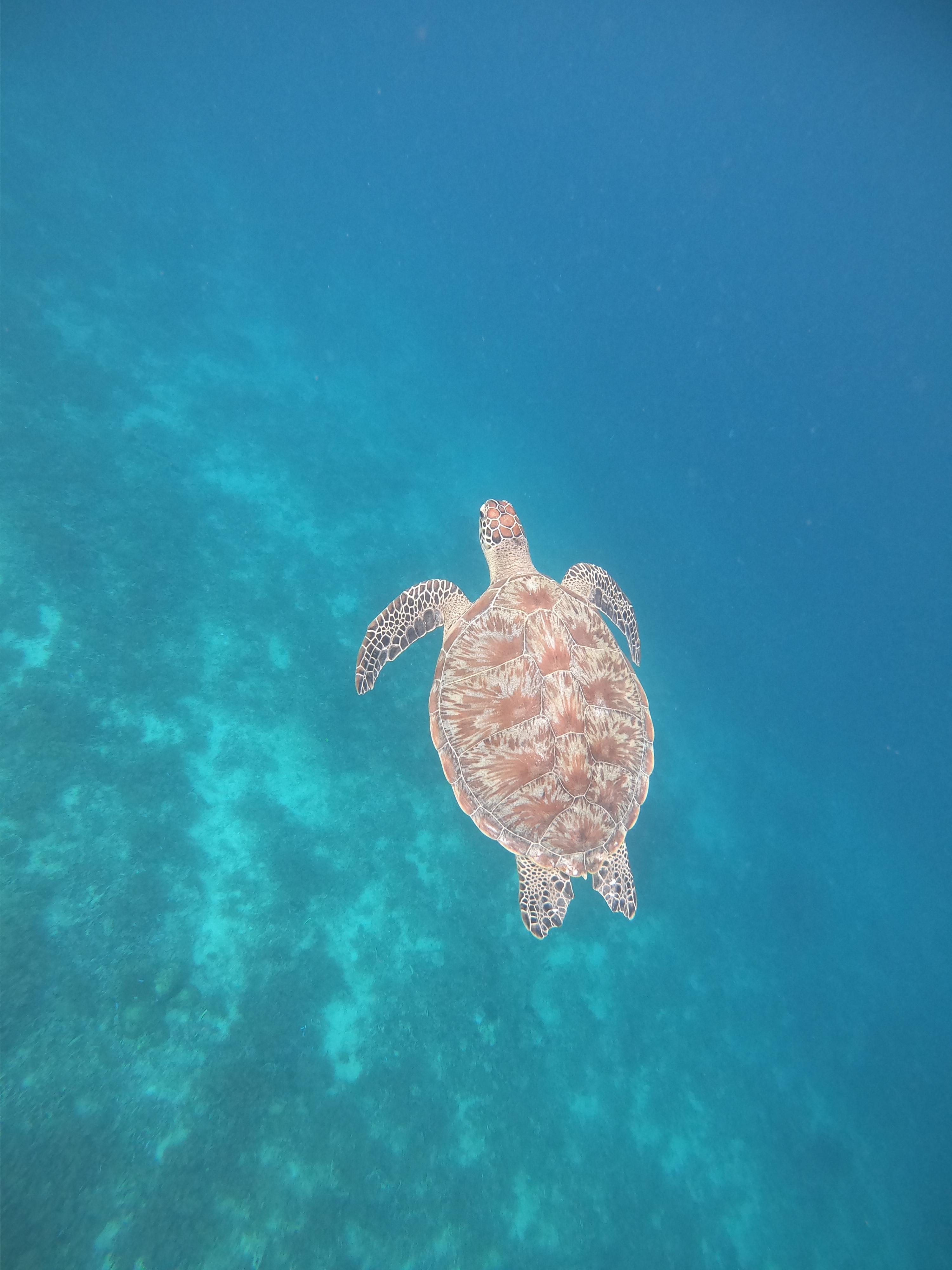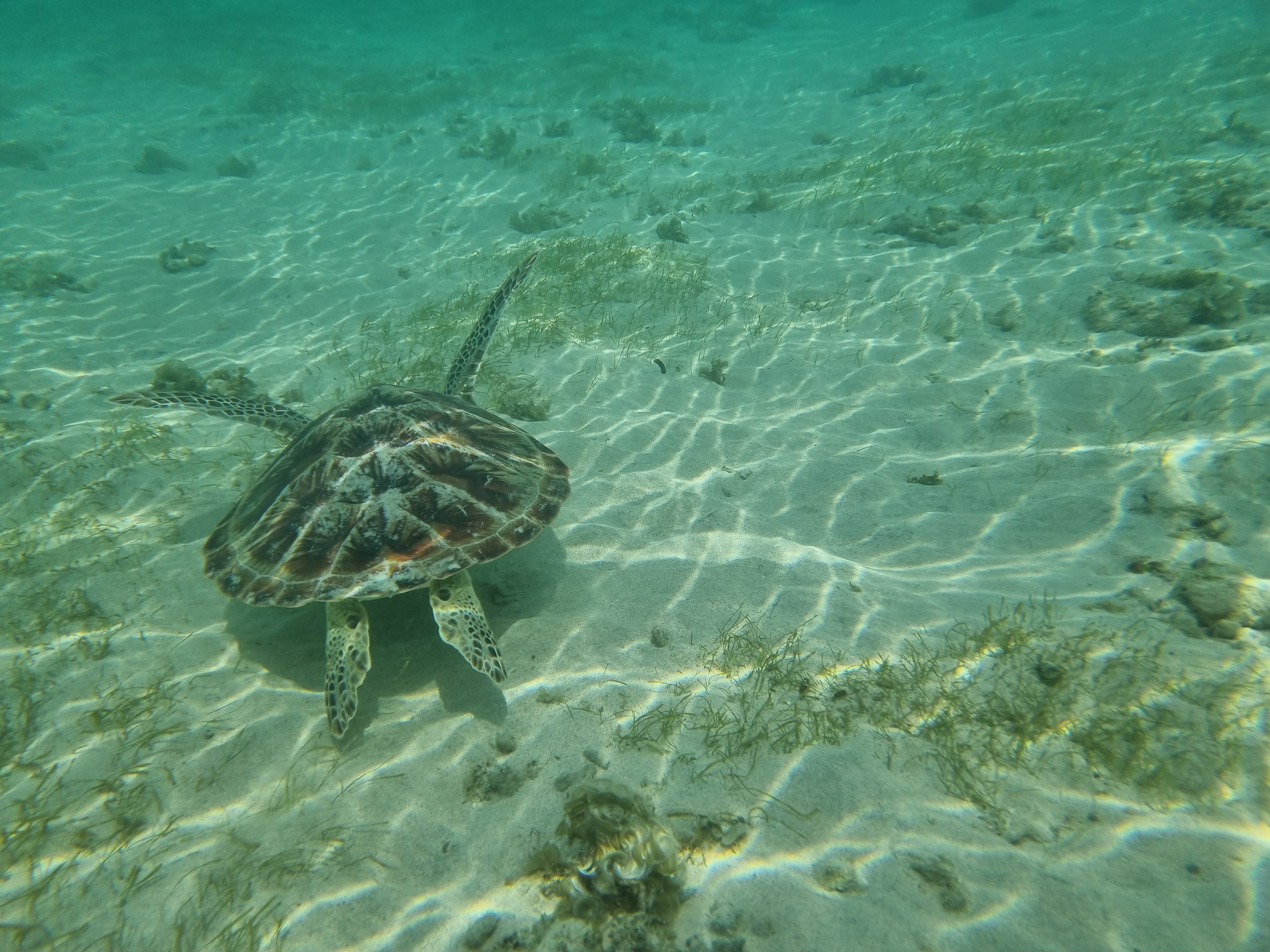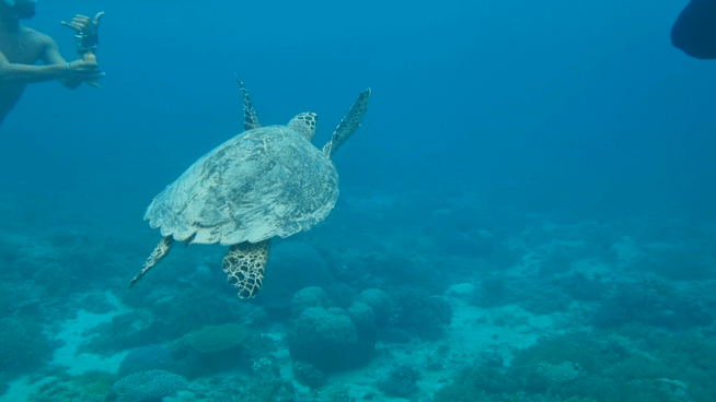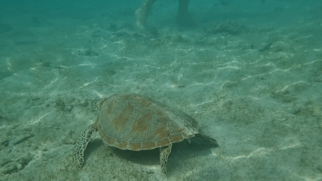 제 허리 정도까지 높이의 얕은 바다였는데 거북이가 정말 발 밑에서 자유롭게 헤엄치며 수초를 먹고 있더라고요