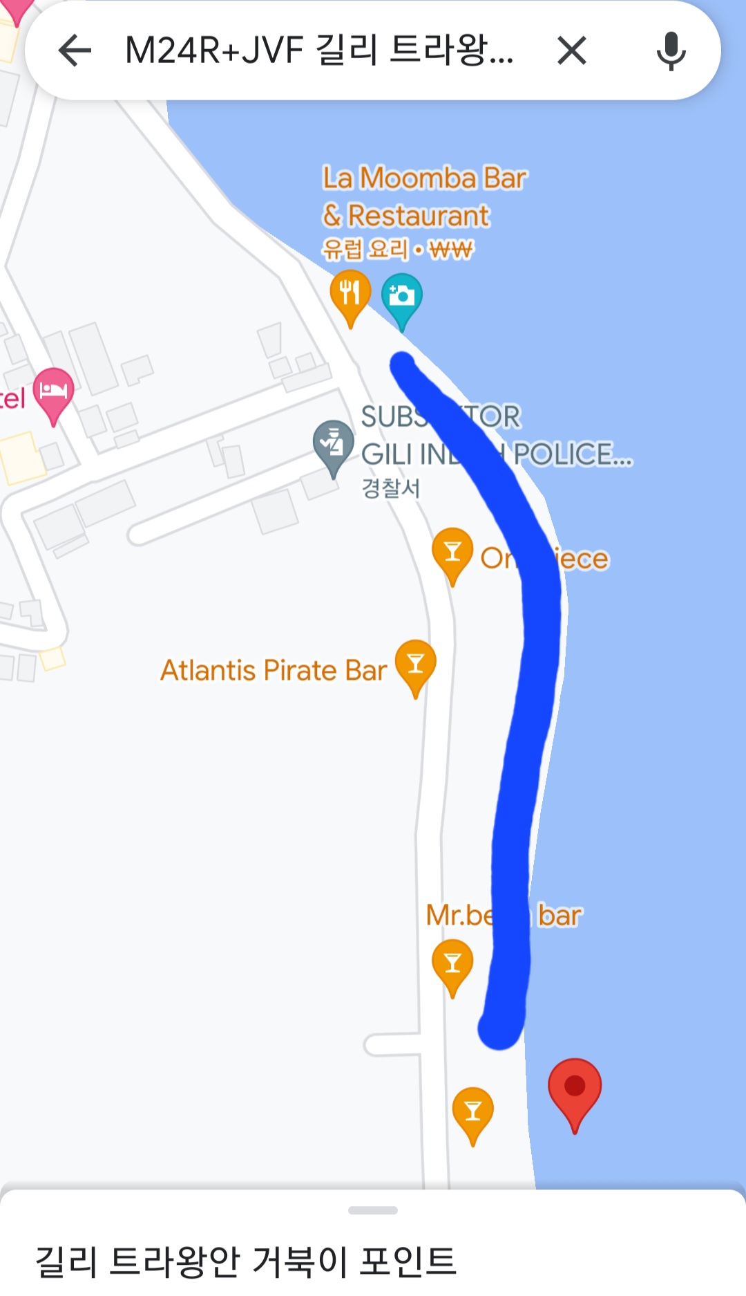 라 뭄바(La Moomba Bar)를 지도에 찍고 레스토랑 바로 직전, 파란 썬베드들이 있는 곳이에요
