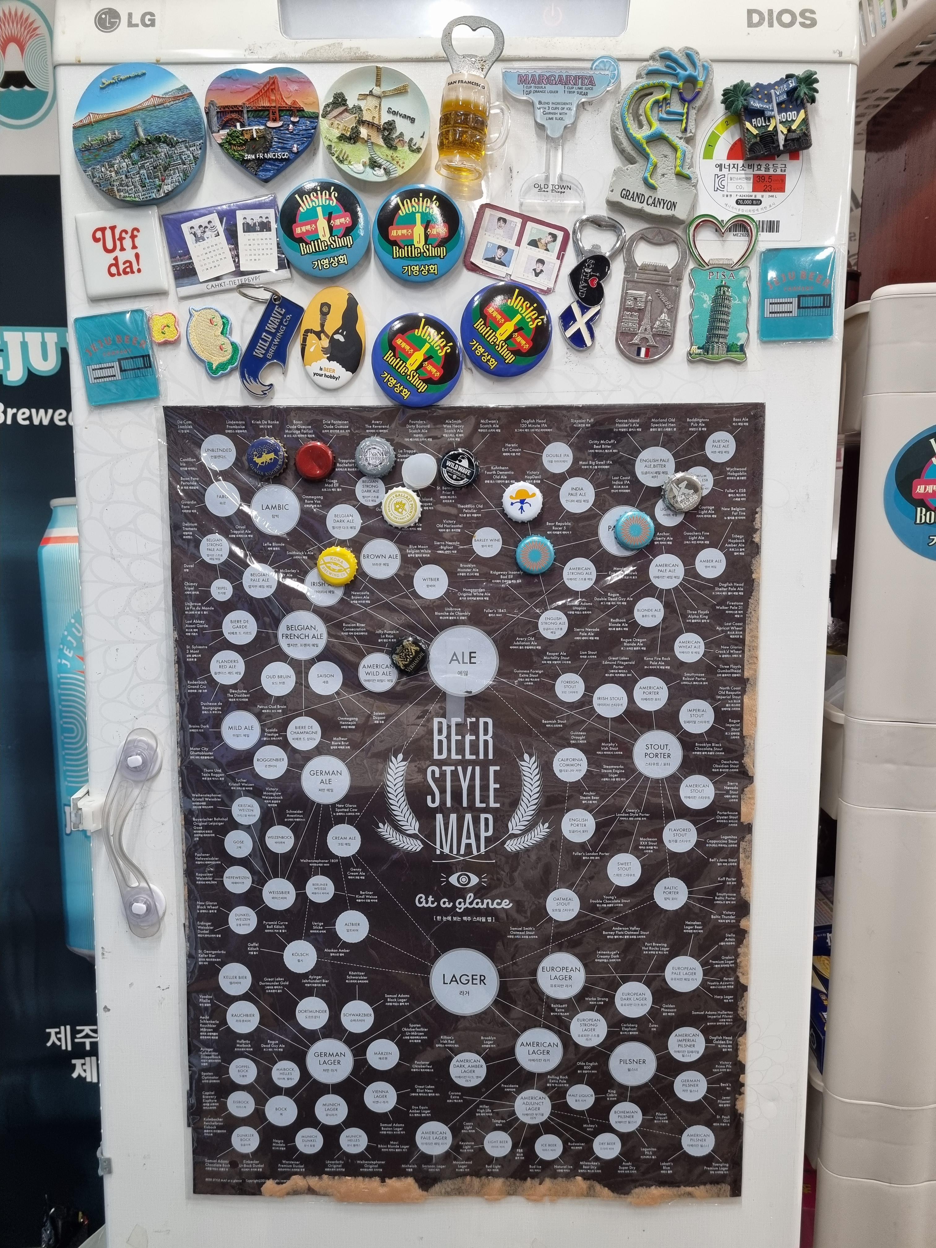 에일과 라거를 기반으로 다양한 파생 맥주스타일 설명이 돼있고 맥주병뚜껑을 관련 스타일 원에 붙일 수 있도록 돼있더라고요